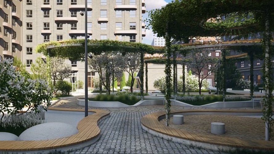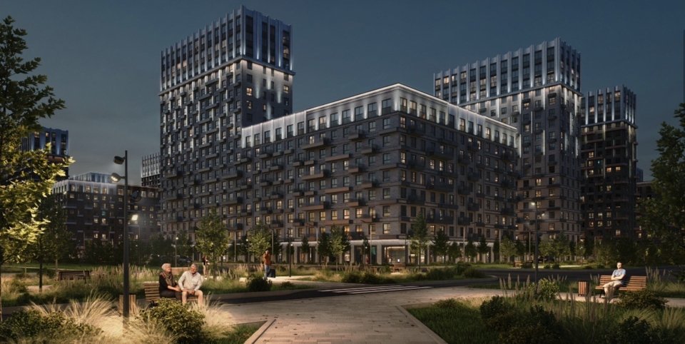 57 гектаров территории, спроектированной в неоклассическом стиле. 8 домов с переменной этажностью и архитектурной подсветкой от 9 до 18 этажей